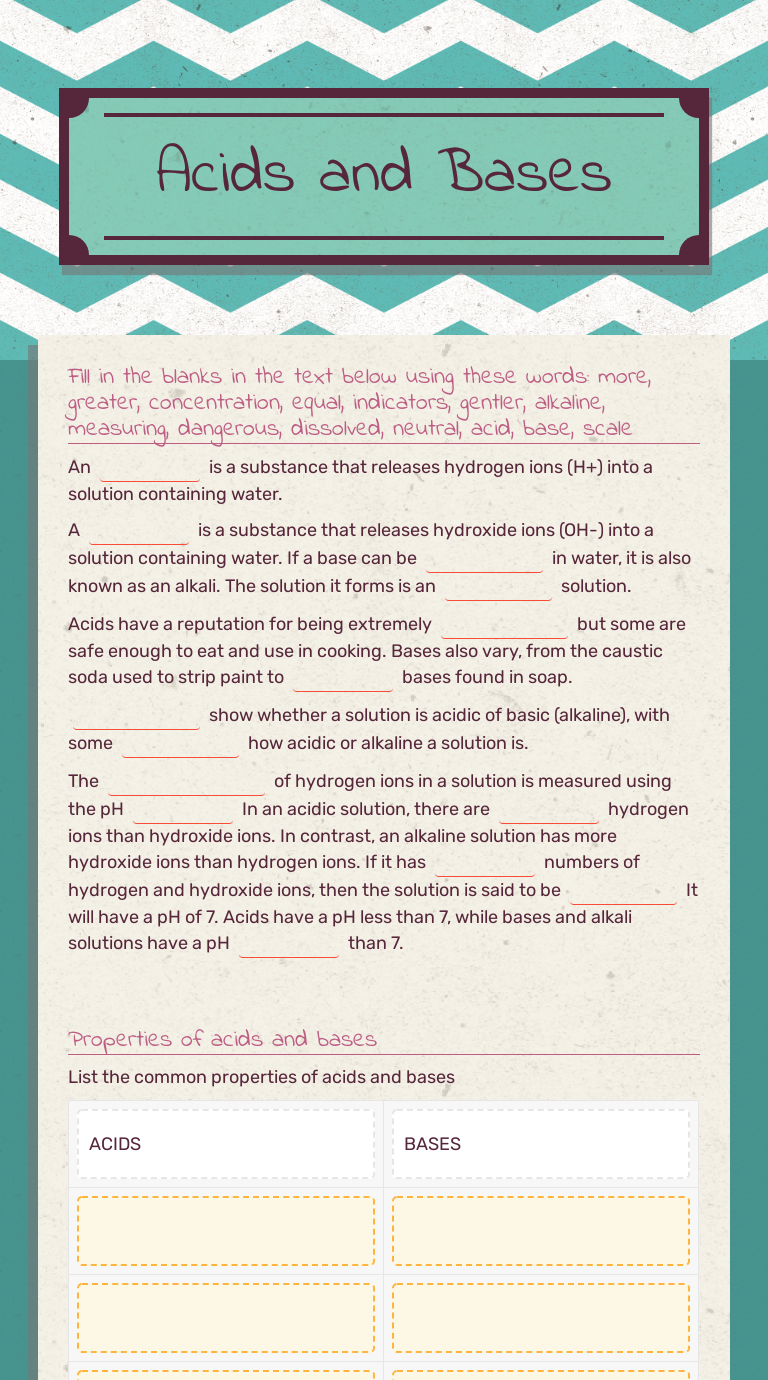 Acids and bases can be described ph is a measure of the acidity or alkalinity of a solution. At the beginning of the chapter we mentioned that we encounter many examples of acids. Properties, base properties, acid examples, base examples, ph scale, and buffers. Acids, bases, and salts worksheet. water ½ l1 lneutral0.00 lwateracidicbasic024681012147ph—drain cleanerhand soapbloodspitwatermilkchicken soupcoffeeorange juicesoda popvomitbattery acid. The worksheets are offered in developmentally appropriate versions for kids of different ages. Indicators for small volume samples. You can do the exercises online or download the worksheet as pdf. Examples of bases and alkalis. The worksheet is an assortment of 4 intriguing pursuits that will enhance your kid's knowledge and abilities. This page introduces and explains the ph scale measuring the relative acidity and alkalinity of aqueous solutions, that is solutions of substances dissolved in water. Students will link together the strength of the acids and bases and their corresponding ph value. This acid and base (doc) worksheet from mr.